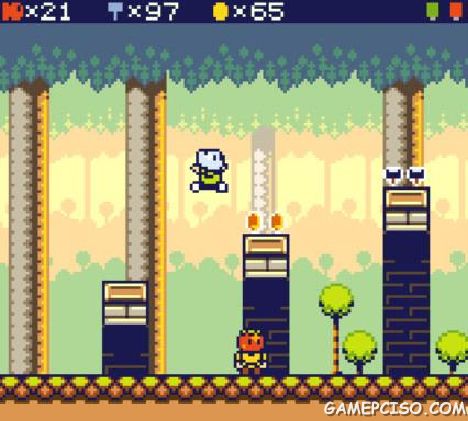 The game is based around a big overworld with 50 doors. Most of these doors lead to levels, some to other locations. In most levels you have to collect usb-keys to open doors, find switches, collect hammers and defeat enemies. Some levels have light puzzles, others have mini bosses. The game has around 40 enemies and other dangers. You can get new moves (like wall-jumping and swimming) in labs, opening new parts of the game. In some levels you get help from a goose, which somehow stumbled into the game. He will fly you to places, or you can ride him when he is too lazy to fly. The game features simple but tidy, low-res pixel art graphics and a very limited palette. The music and sounds are chiplike.